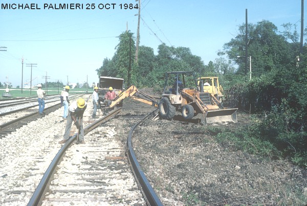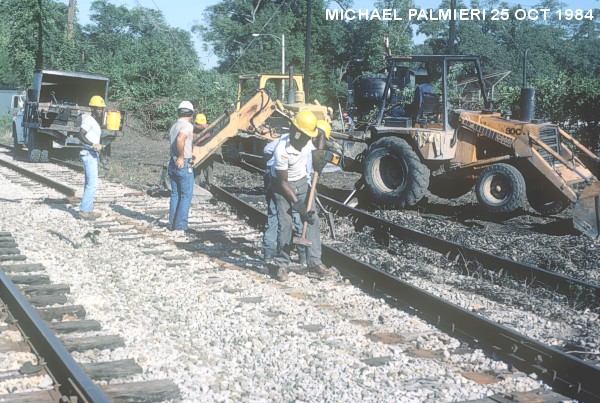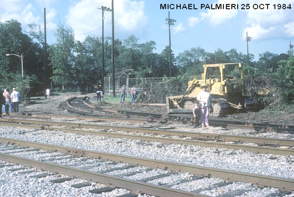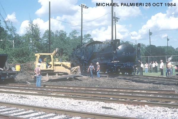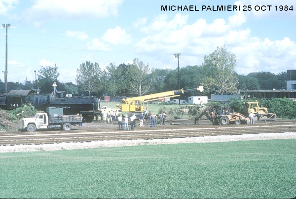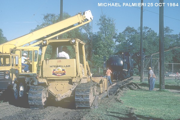 In the Fall of 1984, a crew of OKRA volunteers began to move 745 using panel rails that had been donated by the Southern Pacific Railroad. The panels were put behind the train and 745 was pulled along with a bulldozer. With only two panel rails, the crew kept alternating pieces of track by moving them from front to the back all the way to the main line. After several months of hard work, the Illinois Central Gulf Railroad (IRCGRR) was contracted to bend their main line track to connect to the panel rails to move SP 745 onto the main track.